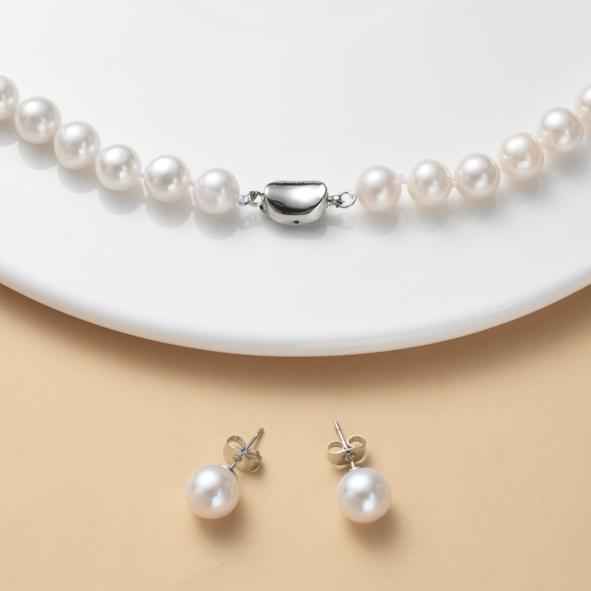 - 【仕様】 ネックレス長さ:約43cm(標準サイズ)/真珠サイズ:約8.5-9mm(本真珠)(ラウンド)/留め具:シルバー925(ロジウム加工・ビーンズクラスプ)/イヤリングまたはピアス付属/ラウンド型(お選びいただけます)。