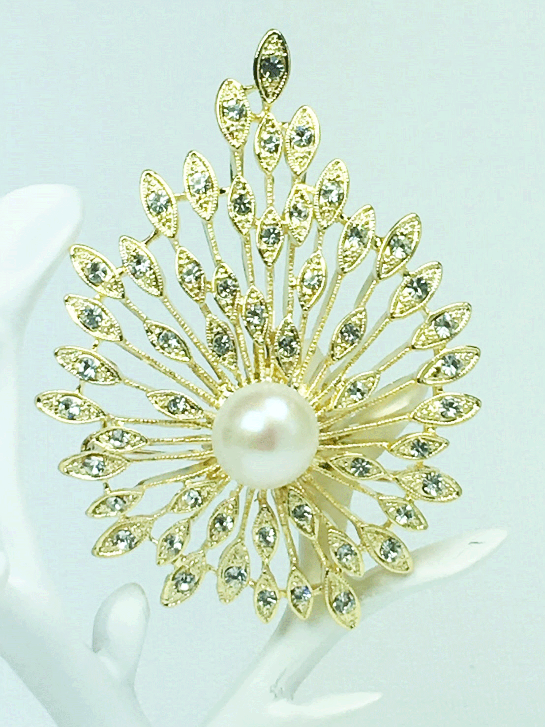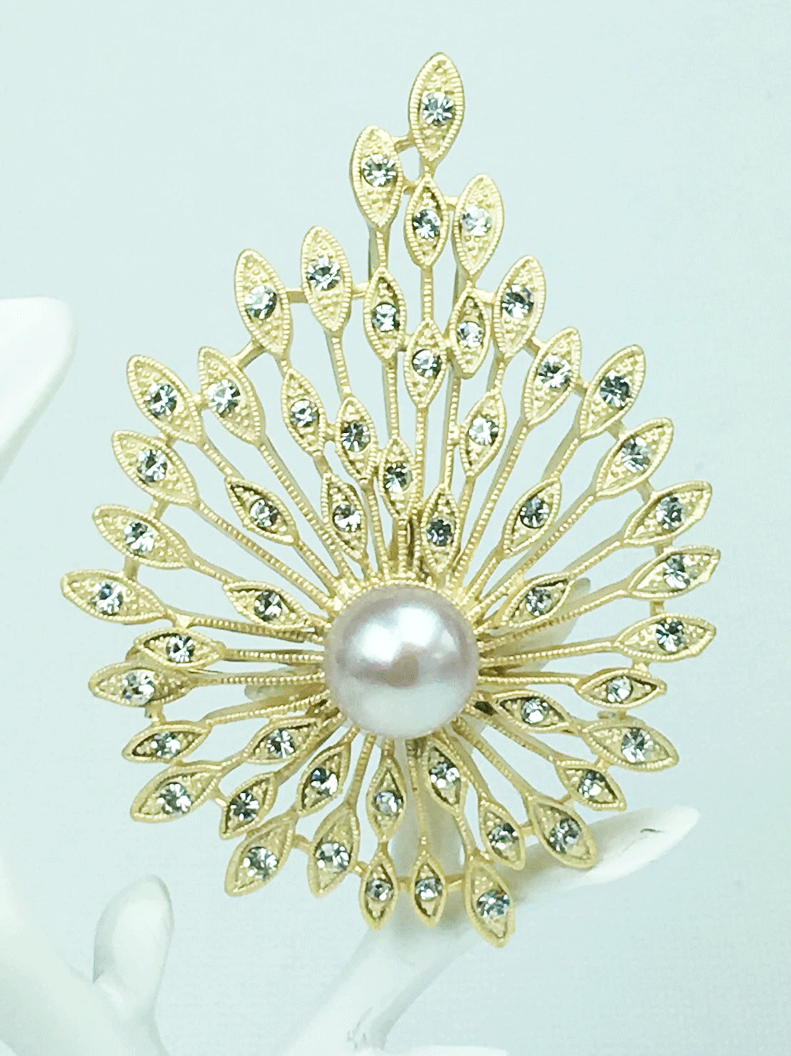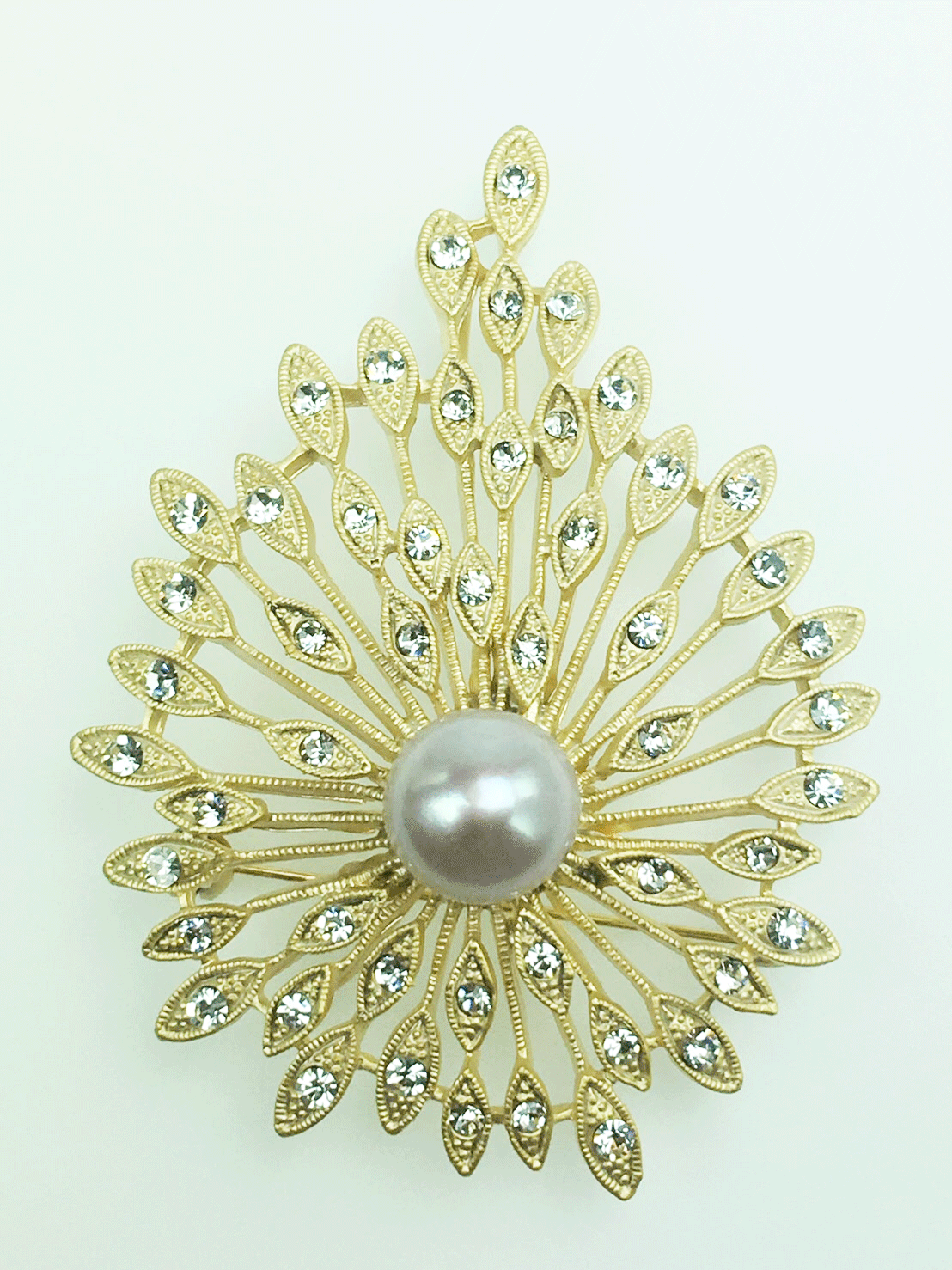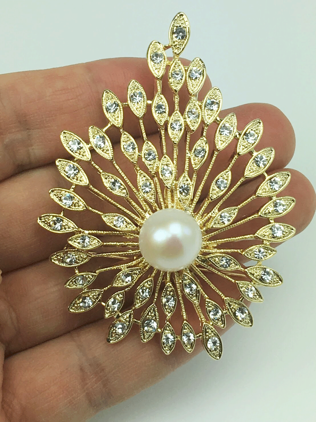 まるで観音菩薩を思い起こさせるような美しいブローチです。 リーフモチーフにガラス細工を埋め込み豪華に仕上げました。 全体サイズ約5-6cm 真珠サイズ10mm 数に限りがございます。 即購入可能。